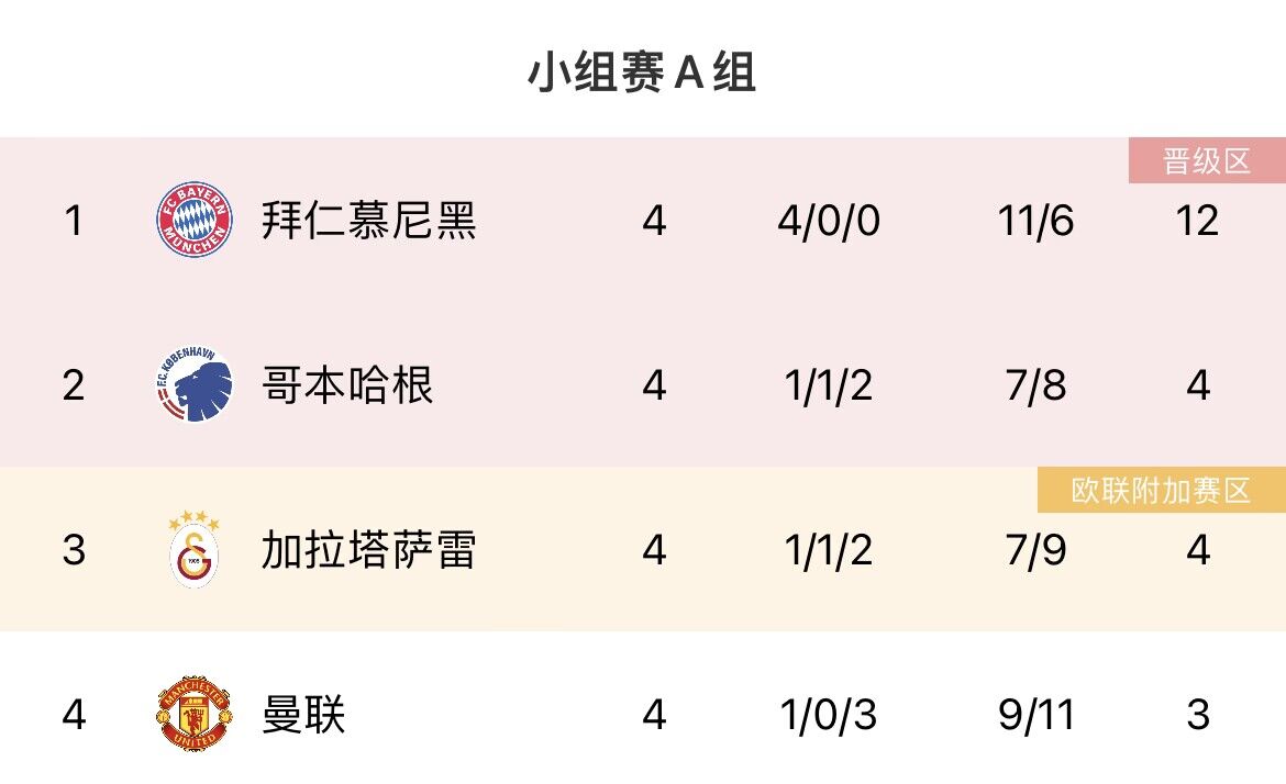 拜仁12分提前锁定小组第一,曼联3分垫底。下轮曼联客战加拉塔萨雷,输球即出局。