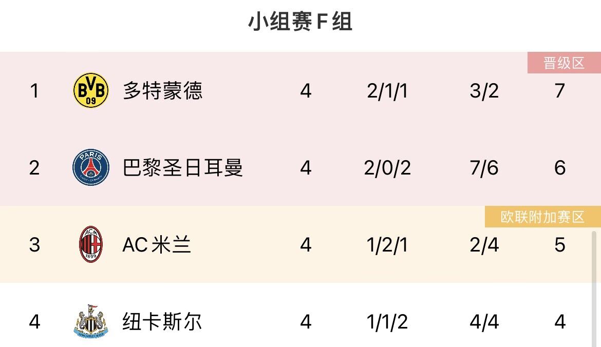 多特7分领跑,纽卡4分垫底。纽卡下轮输球则出局。若下轮多特、巴黎均取胜,则两队一起出线,米兰、纽卡出局。